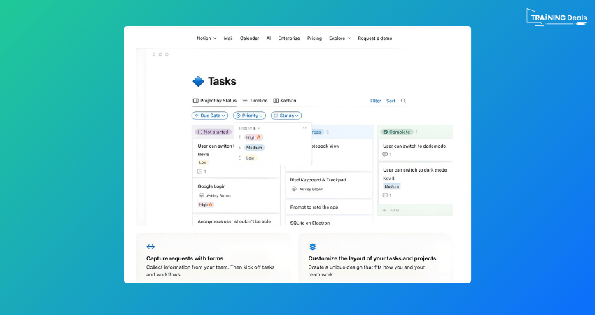 Notion has evolved from a simple note-taking app to a powerful Project Management and collaboration platform. It combines documents, databases, and task management in a single, customisable workspace. You can build your own dashboards and track progress with Notion.