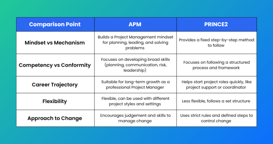 This blog explains APM and PRINCE2, their key differences, and the benefits and drawbacks of each. By the end, you will clearly understand the PRINCE2 vs APM choice and know which option fits your goals and learning style.